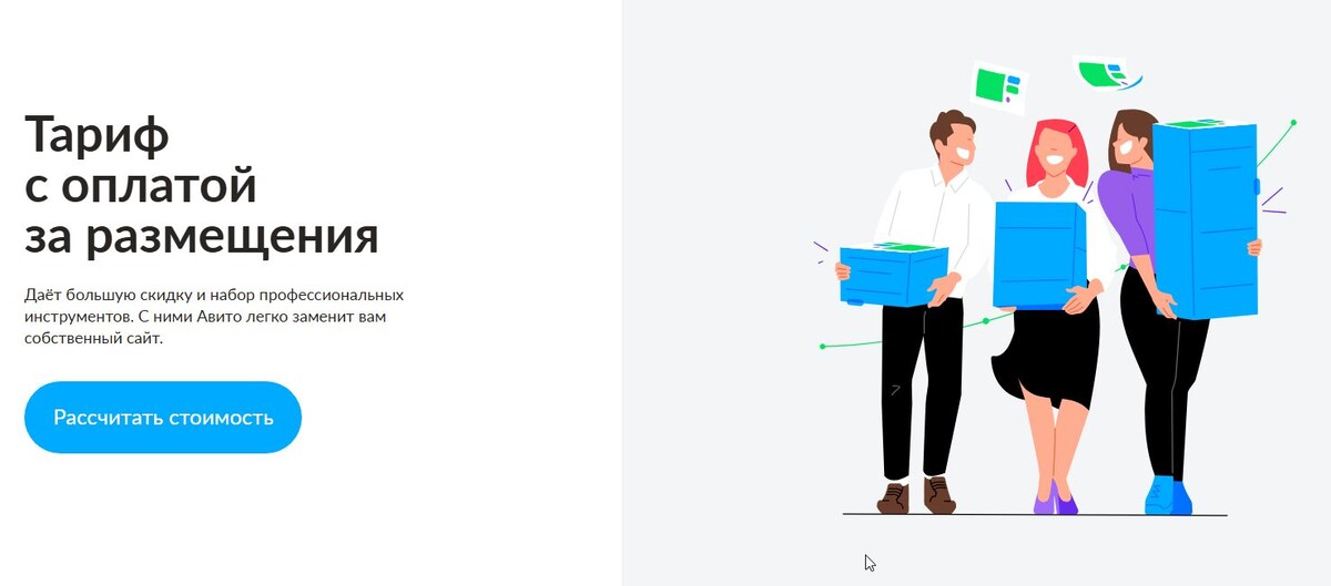 - тарифы Авито с оплатой за размещение, просмотры и сделку;