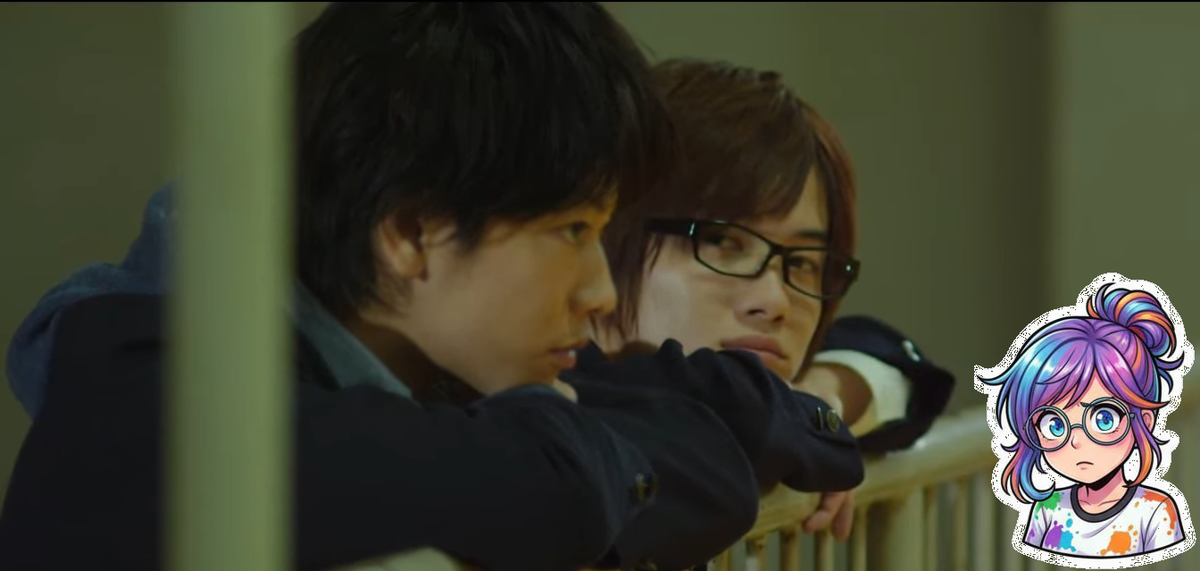 Фильм сглаживает все эти моменты и делает сюжет более взрослым. Особо спойлерить не буду, просто обрисую всё вкратце. Касательно работы — у всех есть основной заработок: например, Фукуда Синта работает в супермаркете, а Накаи Такуро занимается дорожными работами. Работа тут идет как необходимость, а не фон. В манге рисование манги — это всегда на первом плане, почти духовный поиск. В фильме же это работа, которой нужно уделять время после смены в супермаркете или на стройке. Это смещает акцент: герои не просто «следуют за мечтой» — они выкраивают для неё время и силы из своего реального, неидеального быта. Это делает их упорство не данью романтике, а личным, очень дорогим и осознанным достижением.