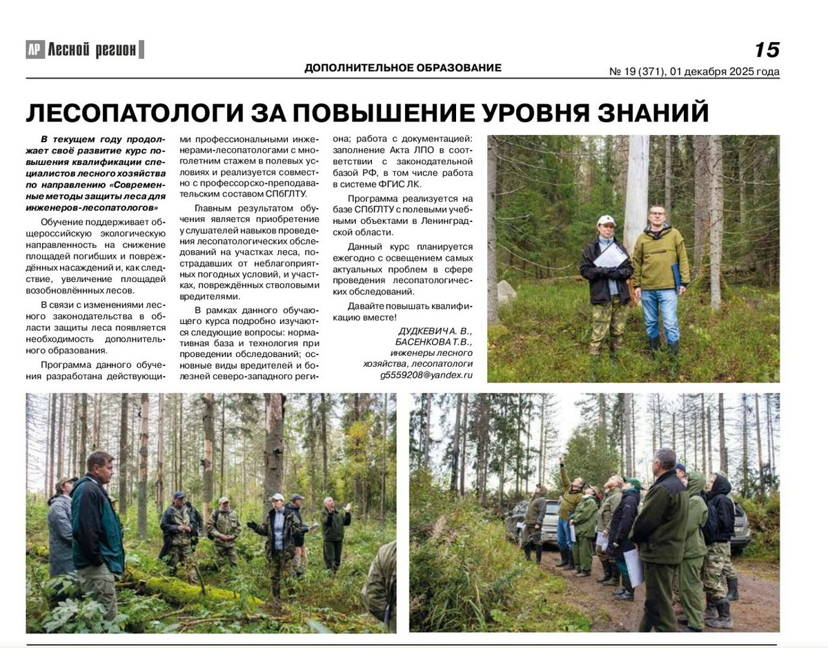 Курсы повышения квалификации для лесопатологов от СПБГЛТУ получили высокую оценку в отраслевой прессе📰 🎓 Проект повышения квалификации инженеров-лесопатологов, организованный СПБГЛТУ совместно с ЛОГКУ «Ленобллес», вновь в центре внимания! О нём рассказала ведущая отраслевая газета Северо-Запада России — «Лесной регион». 👥 Коллектив МЦБО и отдела ДПО СПбГЛТУ благодарит газету «Лесной регион» за внимание к нашей работе! Мы продолжаем совершенствовать образовательные программы для специалистов лесной отрасли. Подробнее — читайте на нашей страничке ВКонтакте ✨ 👻 МАХ | 📲 ВК | 📝 ДЗЕН