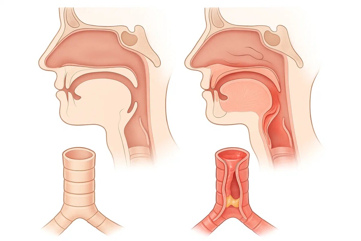 Важный момент: сам по себе вирус редко остаётся «только в трахее». Чаще он опускается ниже — в бронхи (бронхит) или поднимается выше — в гортань (ларингит). Поэтому часто диагностируют ларинготрахеит (воспаление гортани + трахеи) или трахеобронхит (трахея + бронхи). Клинически это означает: осиплость + кашель + возможное чувство «стеснения» в груди.