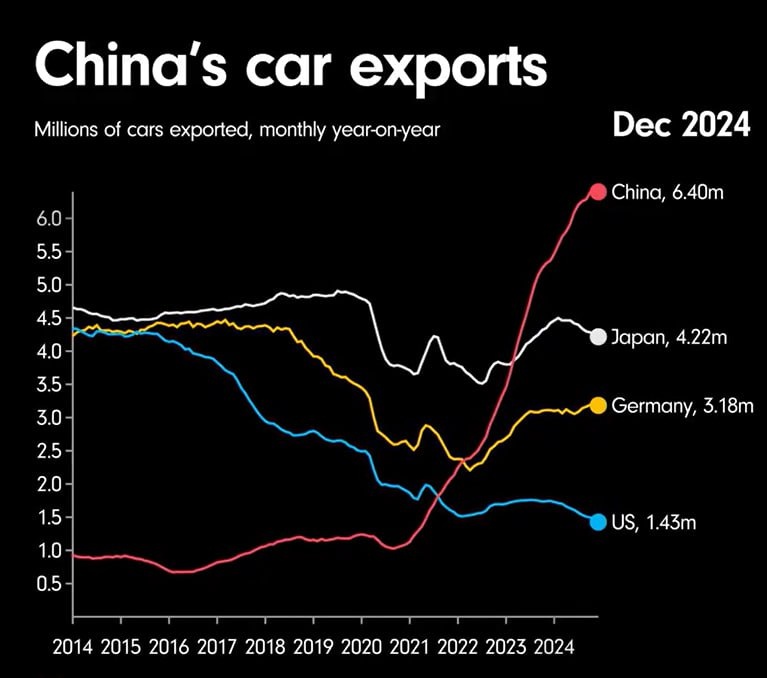 Тем времнем, всего за последние 5 лет Китай 🇨🇳захватил рынок автопроизводства. На графике показан экспорт автомобилей по странам по годам.