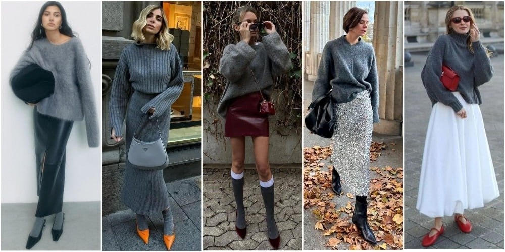 5 стильных способов носить серый свитер с юбкой: 1️⃣ пушистый серый свитер можно скомбинировать с чёрной кожаной юбкой, добавив пару обуви по сезону и стильные аксессуары; 2️⃣ трикотажная юбка в тон свитеру позволит визуально удлинить силуэт и сделать образ незабываемым; 3️⃣ серый цвет является нейтральным, поэтому к серому свитеру можно подобрать юбку любого цвета - красного, жёлтого, зелёного, бордового и т.п.; 4️⃣ серый свитер + серебристая юбка с пайетками образуют стильный тандем, который подойдёт как для встречи нового года, так и повседневных прогулок; 5️⃣ юбка-баллон в светлых оттенках отлично сочетается со свитером серого цвета. В эту комбинацию можно добавить яркие аксессуары. А у Вас есть в гардеробе свитер серого цвета? Подписывайтесь на ТГ-канал: https://t.me/info_styleDZ