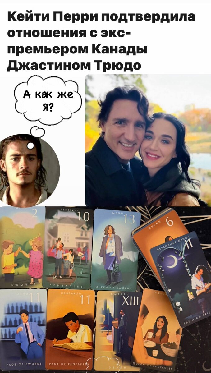 Ничесе, Катерина Перри жениха отхватила: променяла, так сказать, пирата на премьера🐱 А мож политическая многоходовочка? Время трудное, надо проверить теорию заговора) Ну тут 50/50 (2 мечей), по пажу мечей я склоняюсь к более реальной версии—утереть нос бывшему и влететь бульдозером в новые ооочень стабильные отношения, где денег много (10 пентаклей). Такое ощущение, что знакома с Трюдо, Кэтрин будто бы «всю жизнь» (6 кубков), оттого и сошлись так быстро; очень вовремя она ушла от Блума, да и судя по картам, в браке отношения совсем «сошли на нет»—перегорело у нее (Королева мечей, Верховная жрица). Сейчас их с бывшим связывает только ребенок (паж, 10 пентаклей). В перспективе у новоиспеченной парочки аркан Смерть—долгие отношения, которые будет вытягивать женщина (королева пентаклей). Ну что ж, каждый сам кузнец своего счастья. Премьеры на дороге не валяются🐱