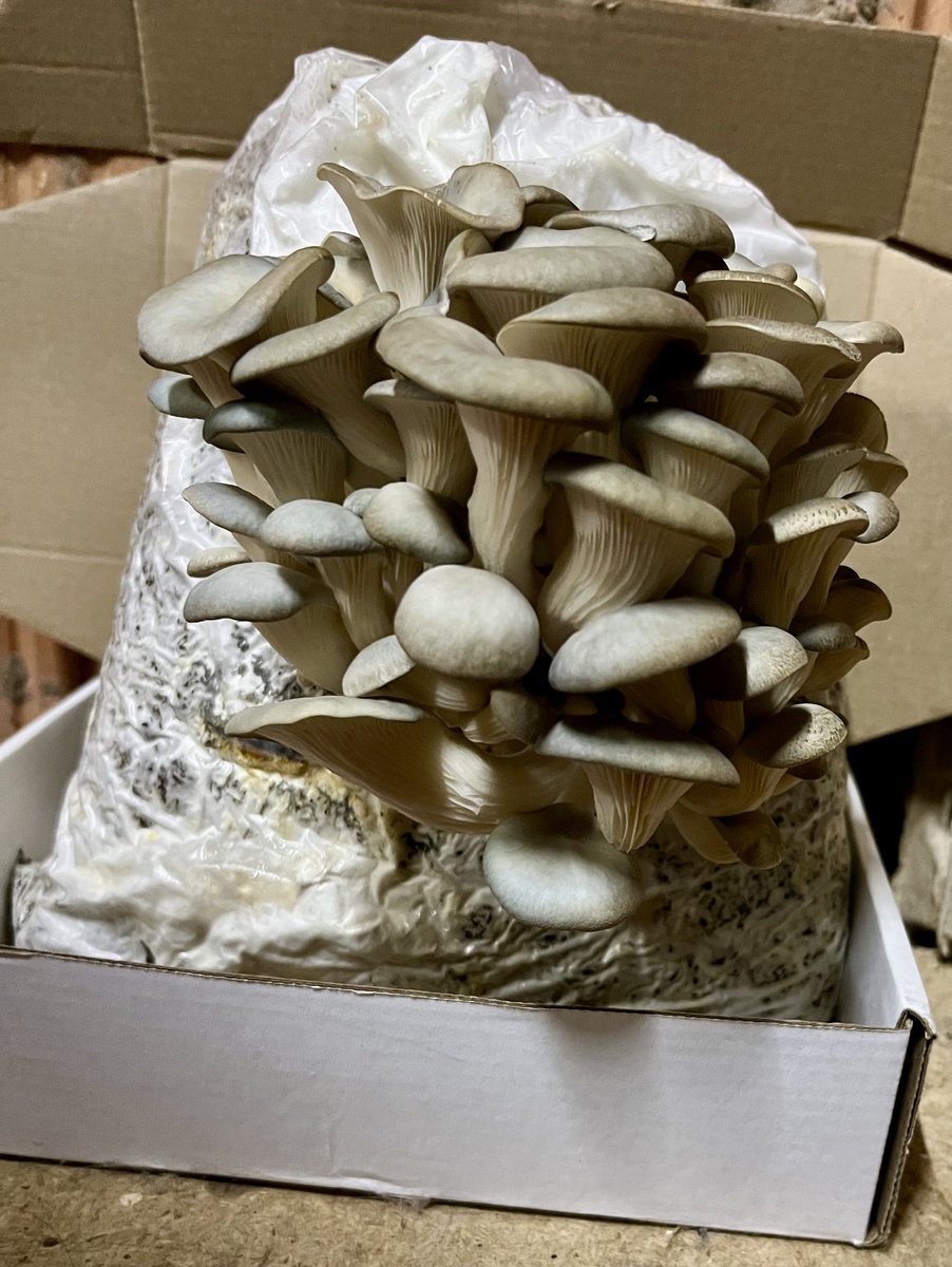 Грибочки эти начали расти не по дням, а по часам. Уже через неделю на грибном блоке наросли вполне крупные красивые плоды.