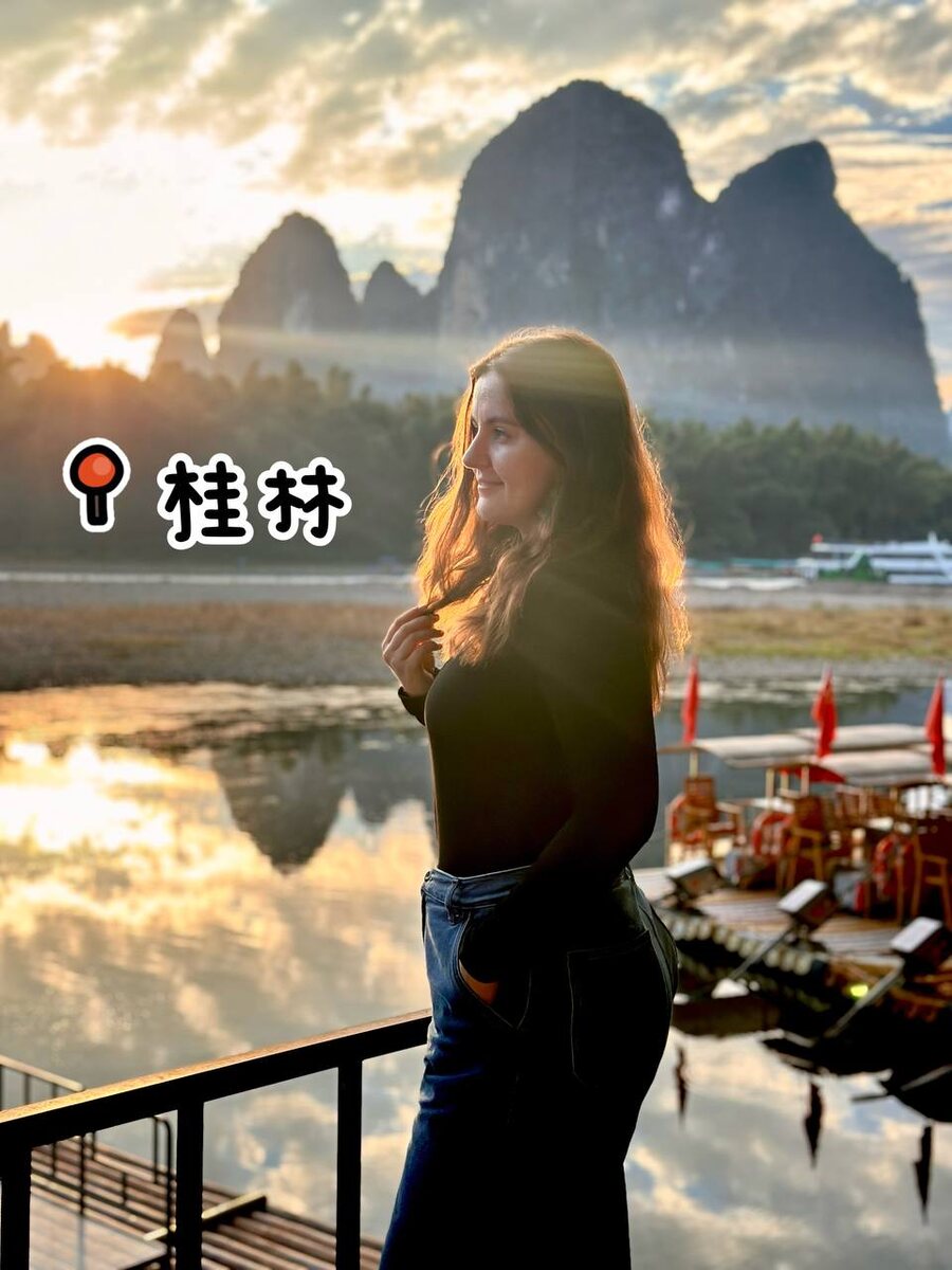 Огромная панорама карстовых гор — закат здесь особенный: густой туман, мягкий свет и идеальный вид сверху. Чтобы туда попасть, нужно прийти в порт, пересечь реку за 5 юаней (расписания нет, каждые 10-15 мин), а потом договориться с местными таксистами отвезти вас к входу. Дорога занимает около 30 минут. Входной билет 60 юаней, подъем всего 20 минут по лестнице на смотровую.
