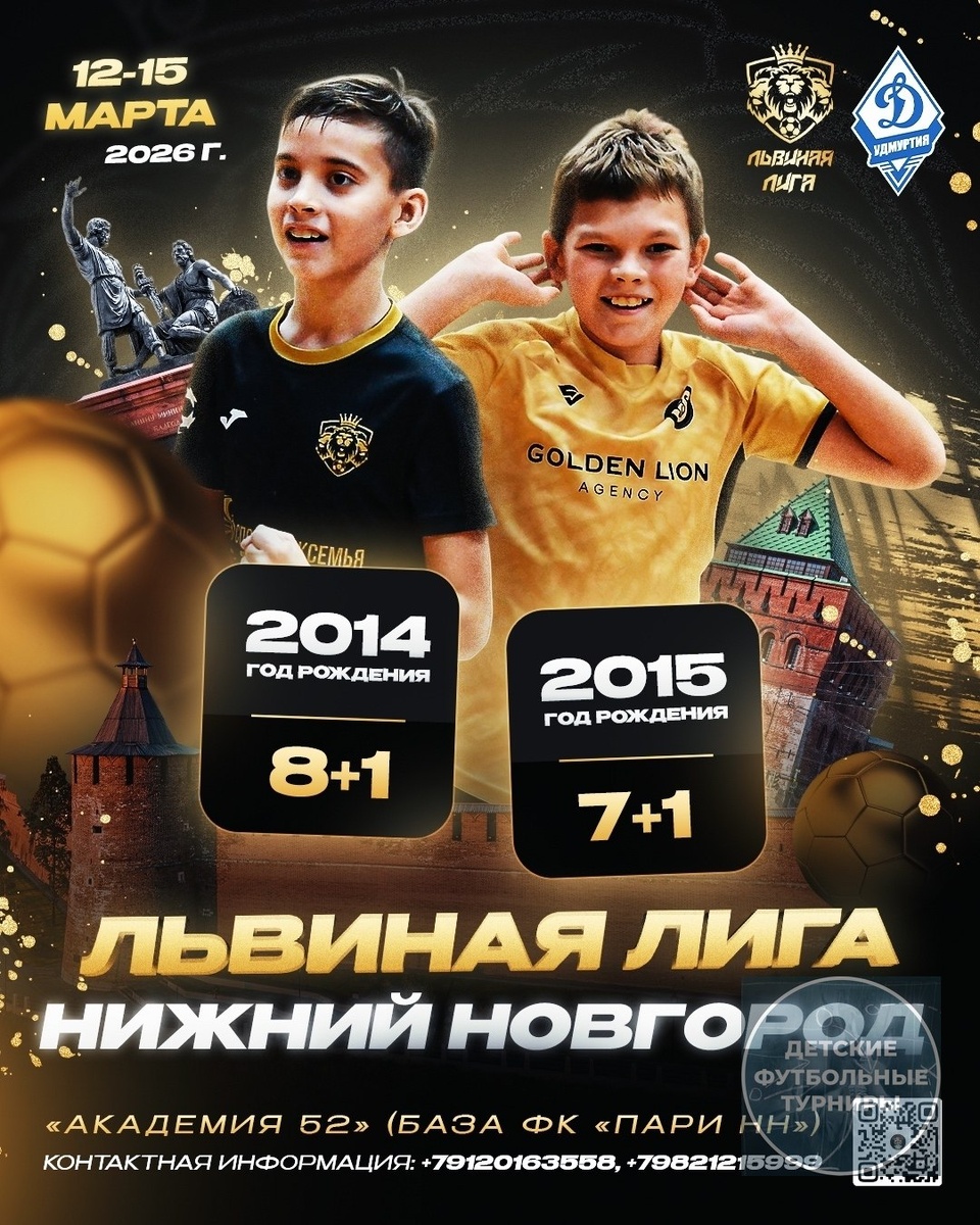 НОВАЯ ГЛАВА В ИСТОРИИ ЛЬВИНОЙ ЛИГИ🔥 12–15 марта состоится Всероссийский турнир по футболу «Львиная Лига — Динамо» в Нижнем Новгороде 🏆 Команды 2014 и 2015 годов рождения сразятся в крутейшем манеже Спортивного центра «Академия 52», который является базой футбольного клуба «Пари НН» 🤩 Приглашаем сильнейшие команды со всей страны стать частичкой большой истории турниров «Львиная Лига»! 2026 год станет по-настоящему жарким — готовьтесь к мощному старту футбольного сезона!👑 📲 По вопросам участия и заявок: 📞 +7 (912) 016-35-58 — Артём Бочкарев (https://vk.com/id164935600) 📞 +7 (982) 121-59-99 — Александр Кузнецов (https://vk.com/id182385598) Источник: https://vk.com/wall-224114653_2294 -— #ФутбольныйТурнирМарт2026 #ФутбольныйТурнирЦентральнаяРоссия2026 #ФутбольныйТурнирНижнийНовгород2026 #ФутбольныйТурнирНижнийНовгород2014гр #ФутбольныйТурнирНижнийНовгород2015гр