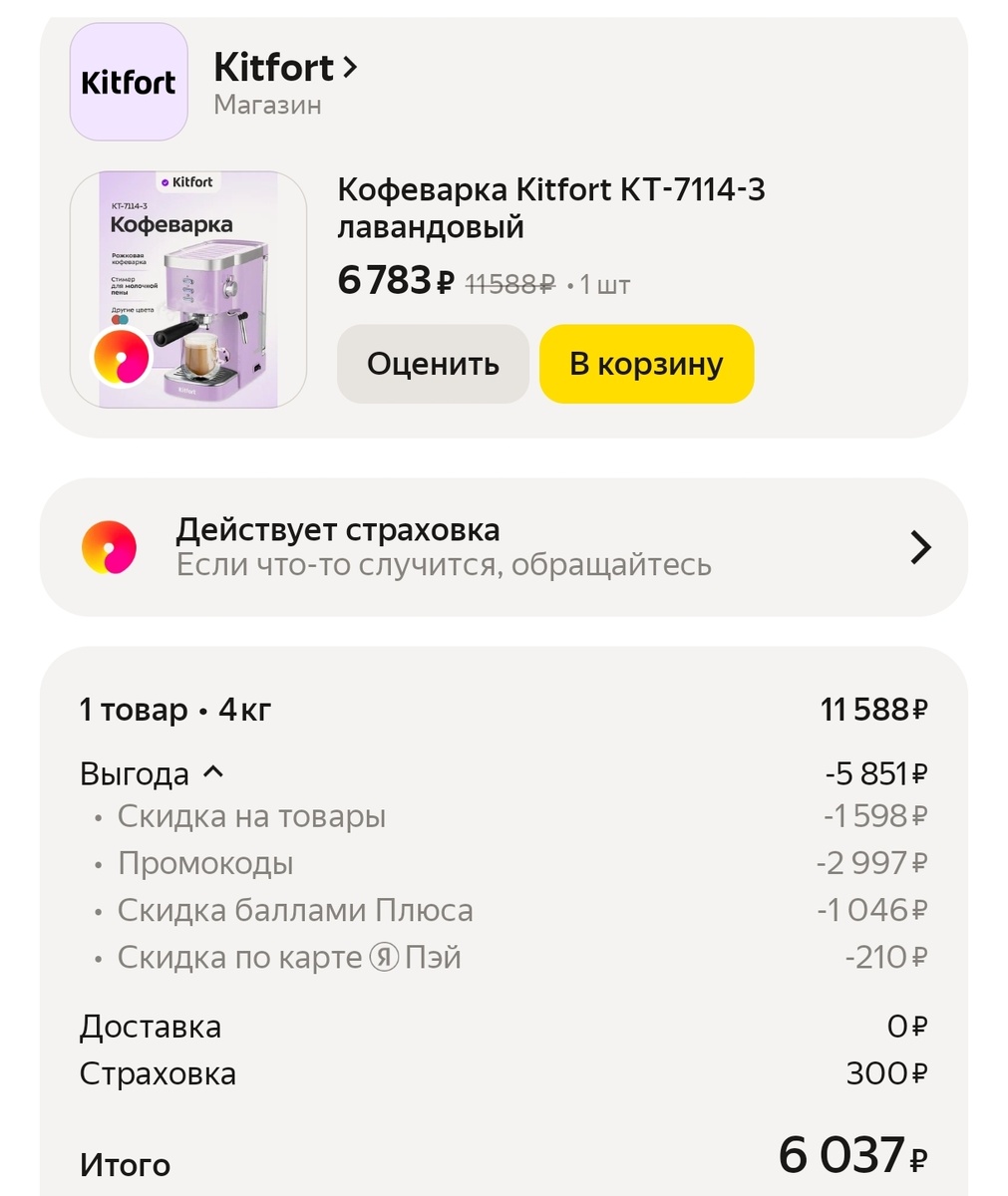 Я взяла ещё страховку, чтобы целый год не переживать о том, что делать, если она сломается. Со страховкой можно будет рассчитывать на ремонт или замену непосредственно от Яндекса, а не ждать ответа от продавца. Покупкой я довольна, хоть все снова не прошло гладко. Сразу после включения кофеварка не подавала воду, я успела испытать весь спектр эмоций и даже уже хотела отнести ее назад, но к своему счастью догадалась позвонить на горячую линию китфорт. Там мне подсказали, что можно попробовать раз 10 запустить режим "двойное эспрессо", пока вода не польется, это помогло. Такой "сюрприз" конечно подпортил мое впечатление от долгожданной покупки. Но теперь о хорошем, о скидках 😏