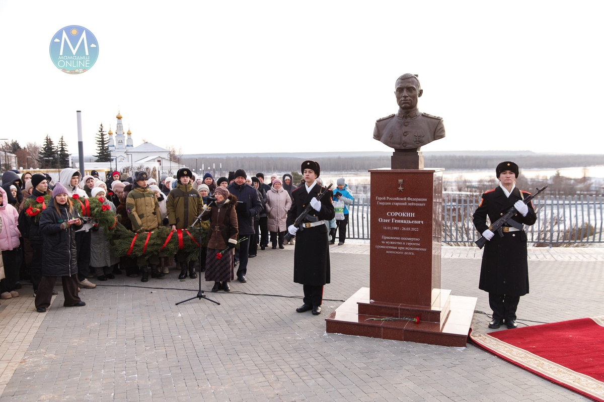 В Мамадыше прошло торжественное открытие бюста Героя Российской Федерации Олега Сорокина. -- В церемонии приняли участие глава Мамадышского района Вадим Ильич Никитин, заместитель Председателя Государственного Совета Республики Татарстан Марат Готович Ахметов, а также родители героя — Геннадий Николаевич и Светлана Владимировна. Присвоенное в 2023 году высокое звание стало признанием мужества и самоотверженности Олега Сорокина, проявленных при выполнении воинского долга. Он погиб в марте 2022 года в возрасте 27 лет в ходе специальной военной операции. ✅ Подписаться l Мы в Max