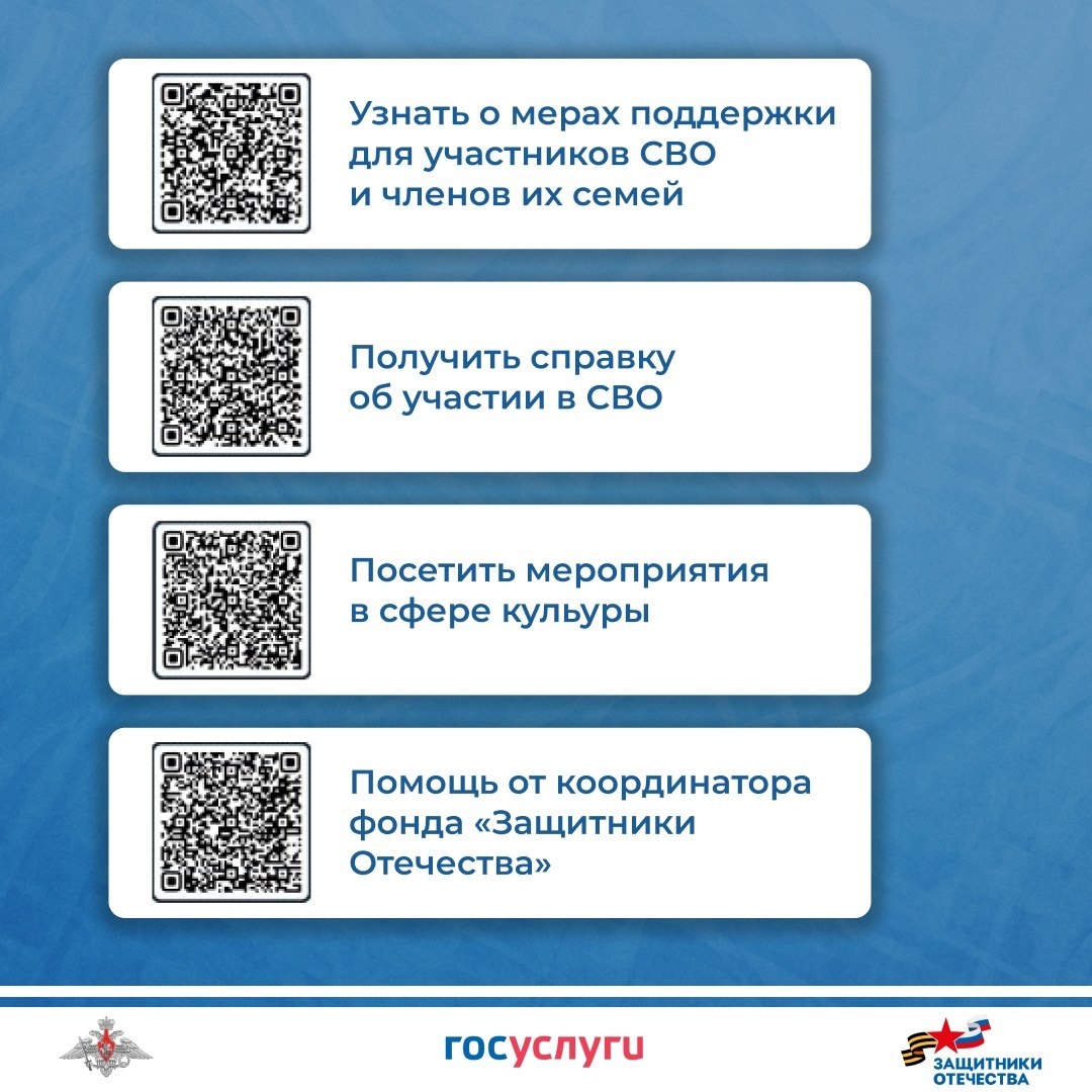 Участники СВО и члены их семей могут получить информацию обо всех мерах поддержки онлайн. Переходите по qr-кодам и получайте помощь от профильных ведомств. Меры поддержки для участников СВО и членов их семей: https://vk.cc/cS6zVa Получить справку об участии в СВО: https://vk.cc/cS6XNA Посетить мероприятия в сфере культуры: https://vk.cc/cS8kNl Помощь от координаторов фонда «Защитники Отечества»: https://vk.cc/cS6AAb