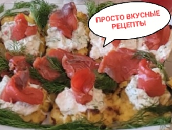 Эта закуска получилась случайно. Переварили картошку для оливье. Нарезали, а вид у нее уже не для салата. Выкидывать жалко, вот и включилась фантазия. Когда гости ели, не могли сразу догадаться, что едят. Приготовление. На лист постелили пергаментную бумагу. На нее ложкой выложили картошку порционно. Запекли в духовке до розового цвета. Когда остыла, сверху "припудрили" майонезом. Свежий укроп перемолоть блендером или очень мелко порезать и смешать с творожным сыром. Выложить сверху на майонез. Солёную рыбу нарезать тонкими пластиками. У нас была чавыча с костями. Часть пластиков свернуть розочкой и поместить в середину каждой порции. Оставшуюся рыбу мы разложили по тарелке и украсили веточками укропа. Получилось очень красиво! Эту закуску можно делать с картофельным пюре или из круглой картошки. Взять среднюю картошку, слегка отварить в кожуре. Разрезать пополам. Выложить на лист и запечь. Можно смазать срез майонезом. В середине сделать углубление. В него положить творожный