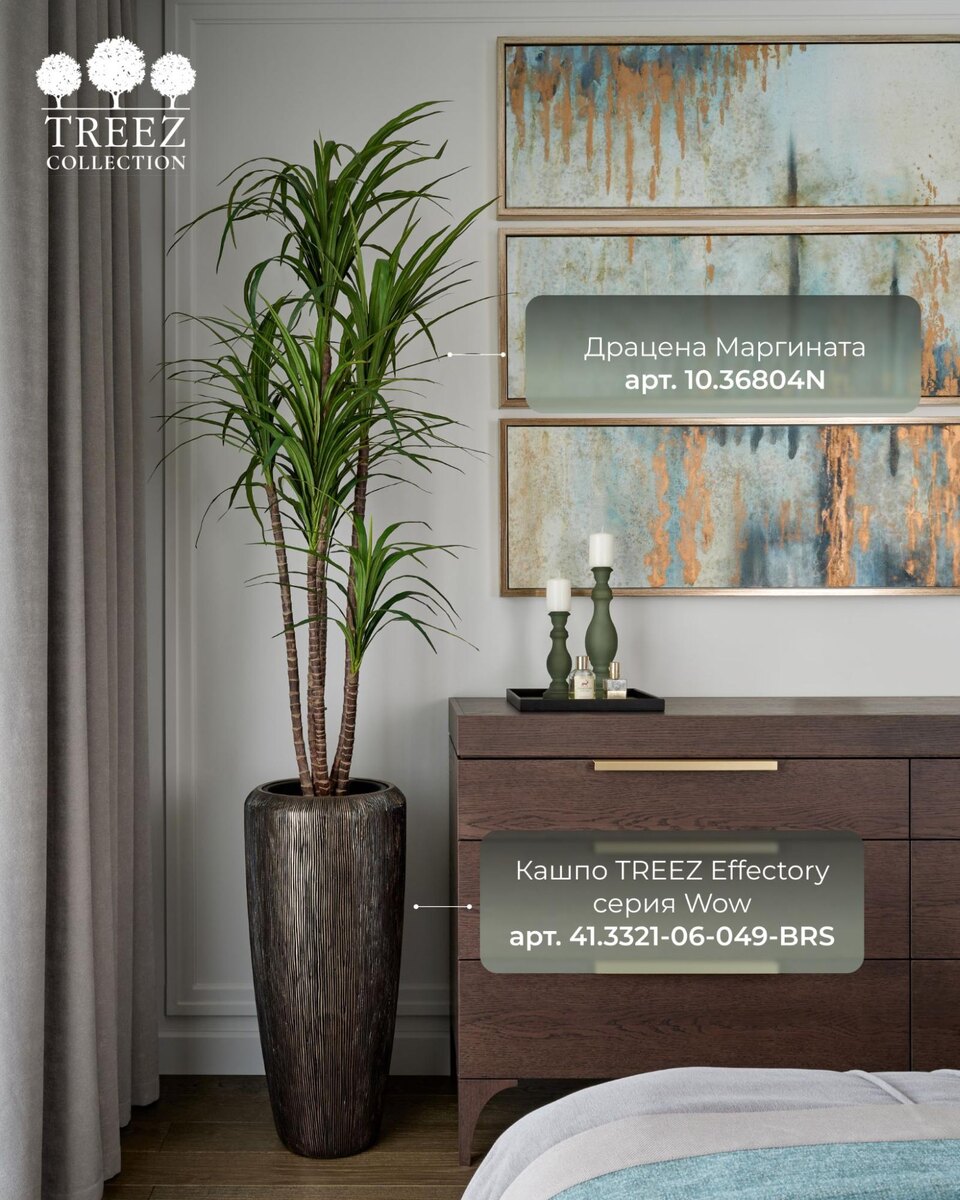 В проекте Елизаветы Конторовской и Ольги Харламовой-Дарти работает логика света и деталей. В светлой комнате кроссостефиум Миллер в кашпо TREEZ Effectory Metal отражает блики и делает пространство визуально легче, а драцена Маргината в кашпо Effectory WOW перекликается с рельефом мебели. Так рождается диалог: интерьер и растения начинают звучать в унисон. Как создавать такие композиции — рассказываем в рубрике «Мастерской фитодизайна» (все части тут) 🌱 Дизайнер: Елизавета Конторовская