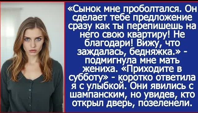 — Простите, — тихо сказала я. — Вы сейчас предлагаете мне подарить вашу сыну мою единственную квартиру, которую я получила от бабушки, в обмен на то, что он, возможно, сделает мне предложение?