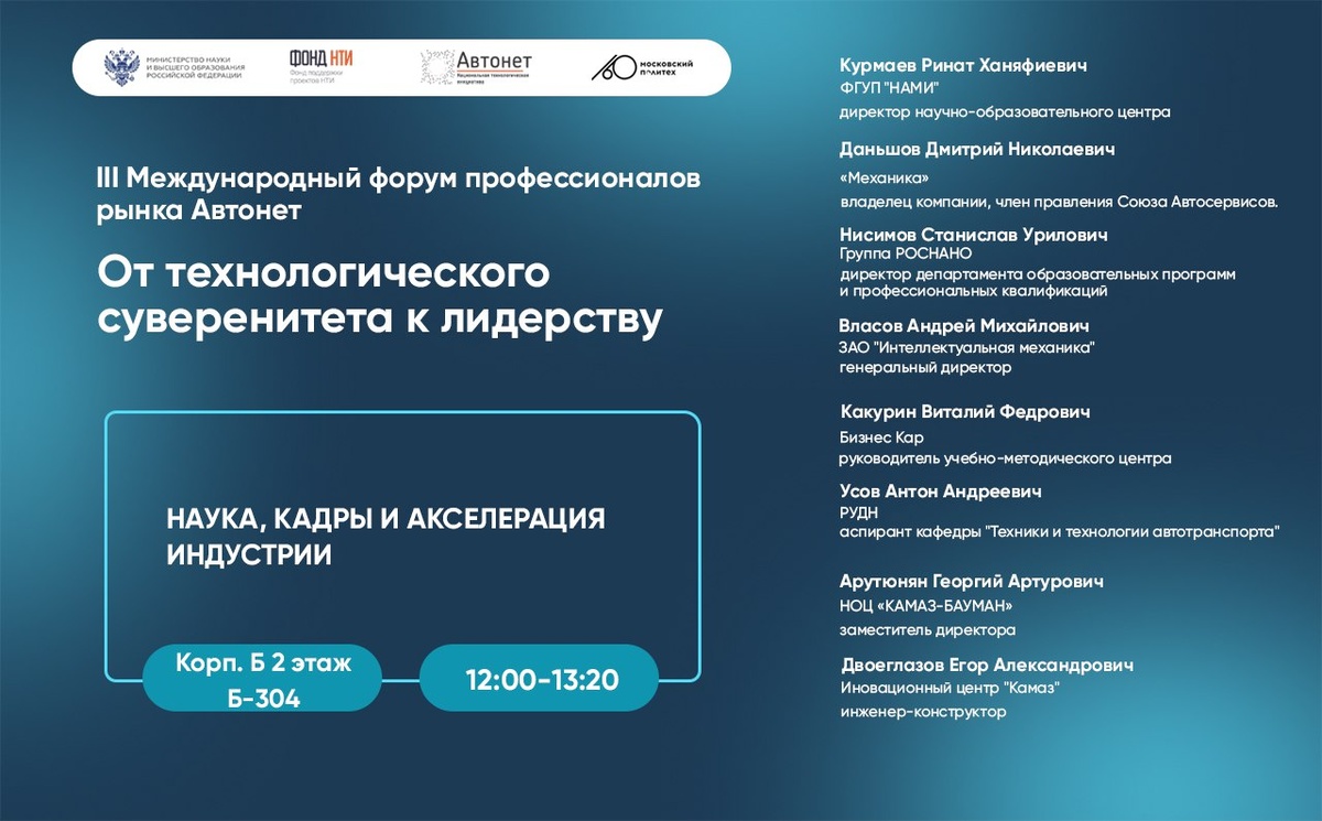 Секция НАУКА, КАДРЫ И АКСЕЛЕРАЦИЯ ИНДУСТРИИ Присоединиться к трансляции. Технологический прорыв в сфере умного транспорта невозможен без формирования новой генерации инженеров, исследователей и предпринимателей, владеющих компетенциями на стыке автомобилестроения, искусственного интеллекта, робототехники и цифровых технологий. Одновременно острый дефицит квалифицированных кадров - от разработчиков систем автономного вождения до техников по обслуживанию электромобилей - становится критическим барьером масштабирования инноваций. Секция объединяет лидеров академической науки, представителей индустрии, технологических предпринимателей, образовательных институтов и институтов развития для обсуждения трансформации системы подготовки специалистов, механизмов трансфера технологий из университетов в промышленность, создания эффективных акселерационных программ для стартапов и выявления технологических пробелов, препятствующих развитию российской экосистемы умного транспорта. Модератор: Келлер
