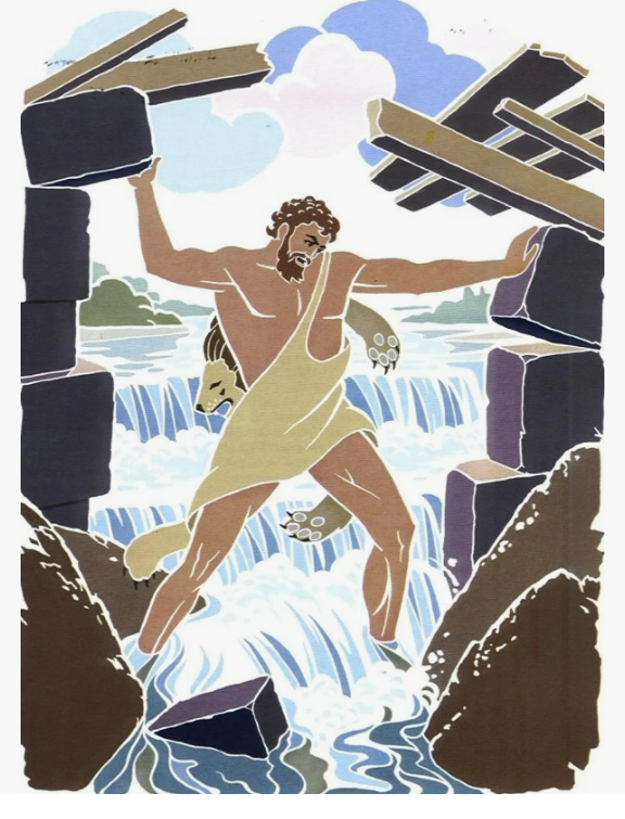Хитроумный Геракл сломал с двух противоположных сторон стену, окружавшую скотный двор Авгия, и отвёл в него воду реки Алфей. Вместо того чтобы чистить конюшни вручную, он использовал природные силы рек, позволив воде смыть грязь и отходы без приложения значительных физических усилий.