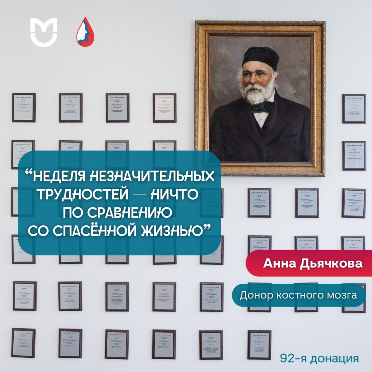 Девяносто вторым донором костного мозга в Регистре Пироговского Университета стала Анна Дьячкова — студентка-журналистка. О донорстве костного мозга девушка узнала, снимая репортаж на благотворительном «Добром забеге», и сразу решила сдать кровь на типирование. Через год раздался звонок, и Анне сообщили о совпадении. «Мне объяснили, что это никак не повлияет на здоровье и что максимум все этапы займут месяц, а сама стимуляция с донацией — вообще пять-шесть дней. Неделя незначительных трудностей — ничто по сравнению со спасенной жизнью», — отмечает девушка. Родители сначала волновались, но потом полностью поддержали: звонили во время процедуры, спрашивали, всё ли нормально. Сама стимуляция прошла намного легче, чем девушка ожидала. «Я думала, что будет гораздо больнее и тяжелее. А когда прошла все этапы, понимаю, что это не больно и не опасно. Если совпадение произойдет еще раз — сразу скажу “да”! Теперь я точно знаю, что это не страшно», — признается она. Анна оставила свои контакты д