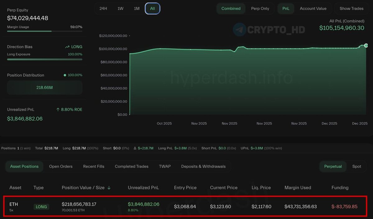 🤨 Инсайдер Bitcoin OG увеличил свой лонг по #ETH с 5х плечом уже до $218,656,000+ (кошелек