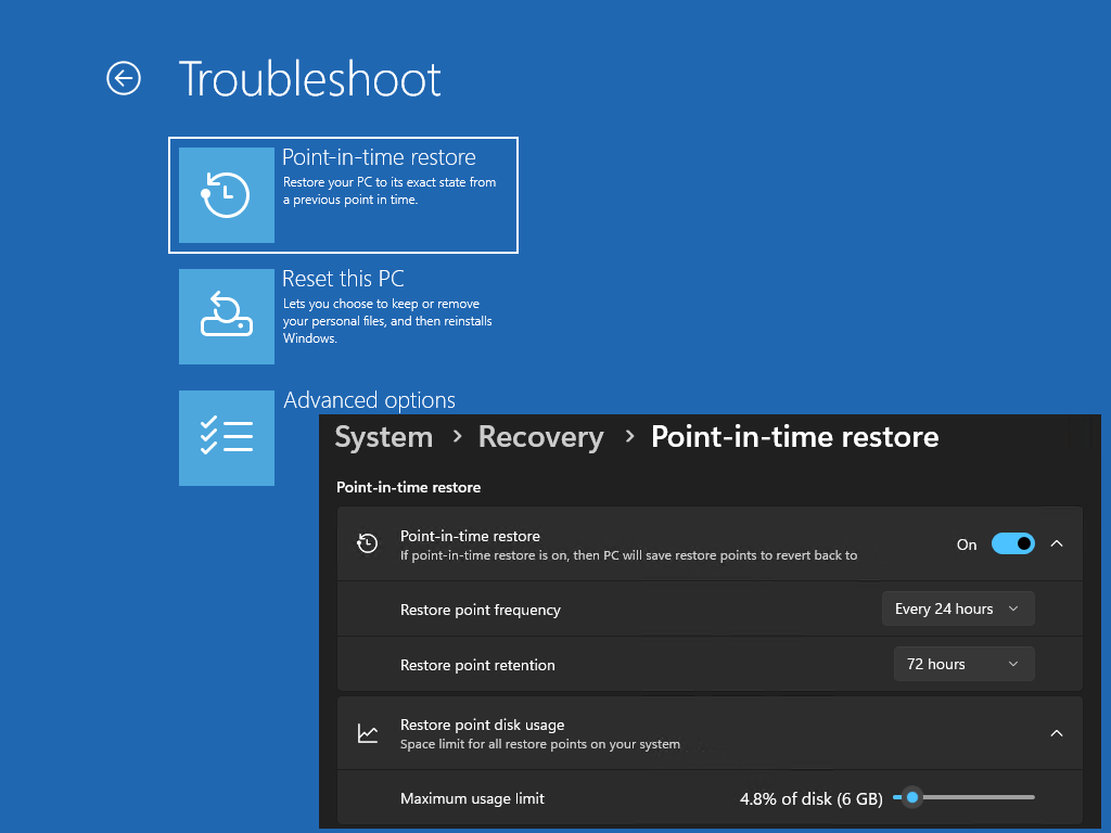 ⚙️ О восстановлении Windows к определенному моменту времени В ноябрьской сборке 26220.7271 появилась новая возможность - откат к состоянию системы на определенный момент времени (point-in-time restore, PITR). Строго говоря, фича не совсем новая, потому что давно доступна на виртуальных машинах Windows 365. Теперь она будет и в клиентских Windows. 📃 Анонс сопровождается подробной документацией, что позволяет нам сравнить новый откат со старым - точками восстановления. Обе функции работают на основе теневого копирования тома (VSS). Дальше отличия. 🕒 Точки создаются только автоматически, через равные интервалы времени. По умолчанию раз в сутки, но можно настроить до четырех точек в день. Каждая хранится максимум трое суток, потом замещается более новой. (В Windows 365 они хранятся до месяца, только платите за облако :) 💾 Стандартные настройки отводят новым точкам не более 2% объема диска (старым - 5% раздела), но можно задать желаемый процент. Новый откат включается автоматически