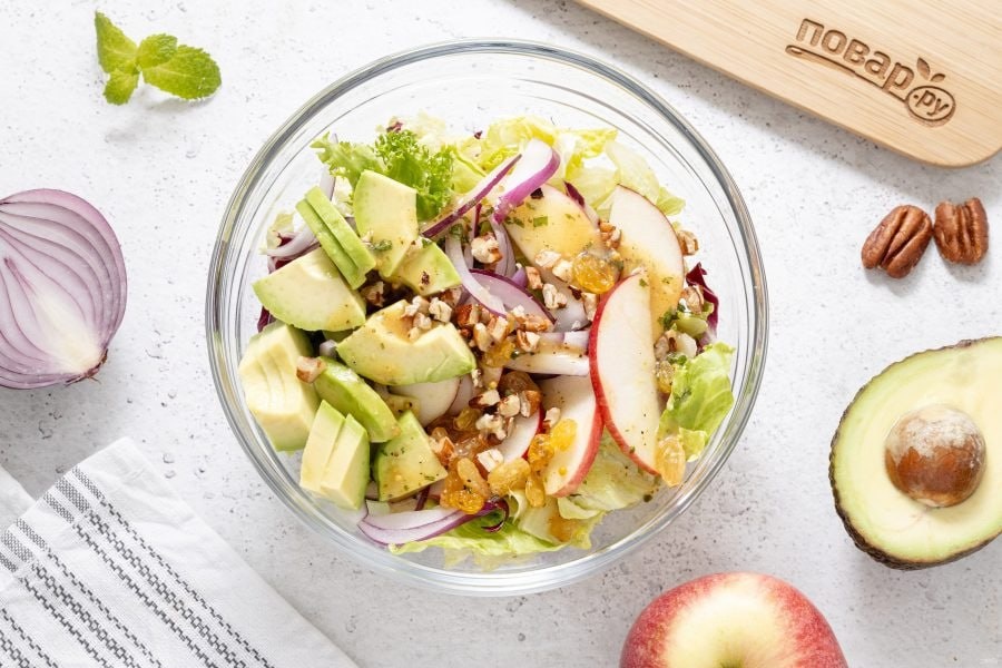 Салат с авокадо и яблоком Идеальный для перекуса. ✅Ингредиенты: Яблоко 1 шт Авокадо 1 шт Лук красный 1/2 шт Орехи пекан 1 ст л. Изюм 1 ст.л. Микс салатных листьев (Айсберг, радичио, фризе) 100гр Масло оливковое Лимон 1/2 шт Горчица дижонская 1 ч.л. Кленовый сироп 1 ч.л. Мята 4 листика Смесь перцев, соль по вкусу ✅Приготовление: 1. Салатный микс выложите в глубокую миску 2. Авокадо очистите от кожуры, удалите косточку и нарежьте ломтиками средней толщины. У яблока вырежьте сердцевину и порежьте на тонкие ломтики. Красный лук нарежьте перьями. 3. Изюм промойте в теплой воде и обсушите с помощью бумажных полотенец. Пекан обжарьте на сухой сковороде до легкого золотистого цвета и измельчите ножом 4. Переложите подготовленные ингредиенты в миску с салатным миксом. 5. Для заправки смешайте оливковое масло с дижонской горчицей, лимонным соком и кленовым сиропом. Добавьте мелко порубленную мяту, черный молотый перец и соль 6. Заправьте салат, аккуратно перемешайте. Салат с авокадо и яблоком