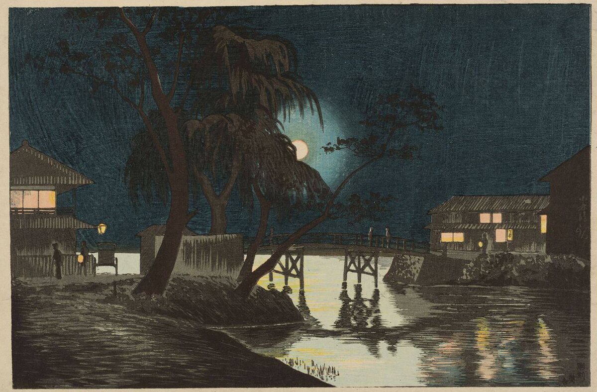Вам открытка! Целых шесть. Их автор, Кобаяси Киётика, создал лиричные и мягкие образы Токио периода Мейдзи — конца XIX-начала XX века. Этот стиль, или жанр, получил название «косэн-га». Косэн-га буквально можно перевести как «картины лучей света». Почему такое странное название? Потому что в центре внимания Кобаяси Киётика был свет. Особенно — ночной свет луны и газовых фонарей. Кобаяси Киётика интересует, как можно реалистично изобразить при помощи цвета световые эффекты — например, отражения на воде, рябь воды. Он включает в традиционную гравюру, которая в то время исполняется мастерами укиё-э, многие элементы и приёмы из западноевропейской живописи. Что это за приёмы, как они попали в консервативную Японию и как изображают Токио современные японские авторы — в онлайн-курсе Анны Гусевой «От Токио до Эдо. Столица глазами художников». Присоединяйтесь!