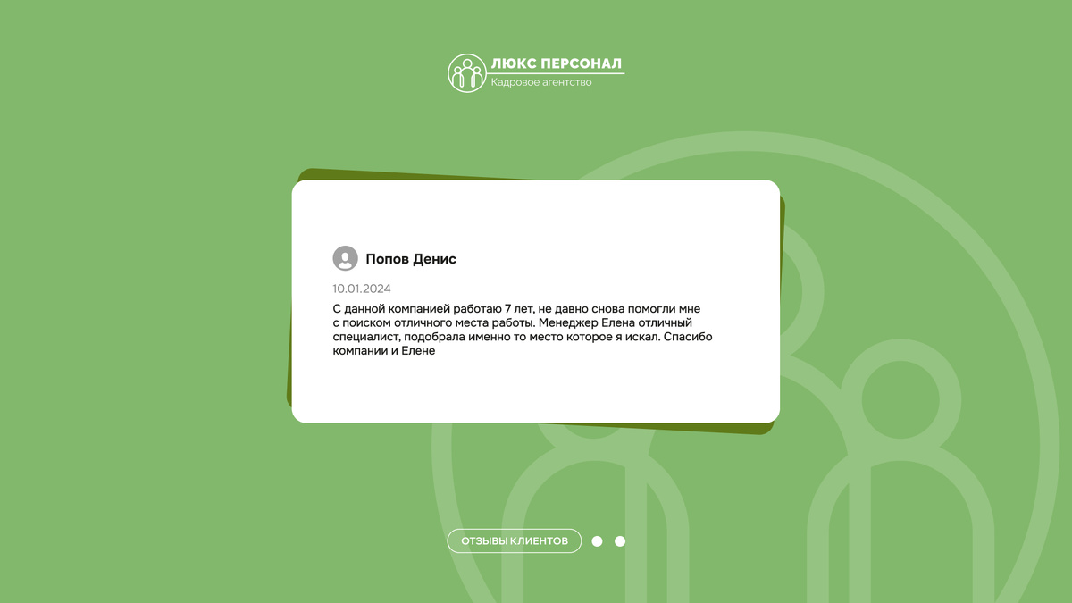Когда речь идет о подборе домашнего персонала, каждой семье важно найти специалиста, которому можно доверять. Агентство «Люкс Персонал» давно зарекомендовало себя как надежный партнер, предоставляющий только высококачественные услуги по подбору сиделок, нянь, поваров и других специалистов. Среди наших клиентов — знаменитости, такие как Елена Темникова, Ольга Погодина, Михаил Григоренко и Валдис Пельш. Это подтверждает высокий уровень доверия и безупречную репутацию агентства. Люкс Персонал — гарант качества и профессионализма «Люкс Персонал» — это кадровое агентство, которое предоставляет комплексные услуги по подбору персонала для дома и бизнеса. Мы предлагаем профессионалов для любых нужд: от нянь для детей и людей с инвалидностью до поваров, сиделок и помощников по хозяйству. Каждому клиенту мы обеспечиваем индивидуальный подход и тщательно отбираем кандидатов, чтобы они максимально соответствовали запросам и пожеланиям. Агентство Люкс Персонал: опыт и доверие клиентов За годы работ