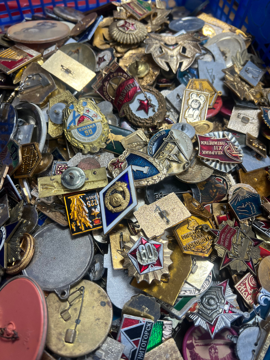 Каждый год мы закупаем от 30 до 50 тысяч советских значков — только оптом, с аукционов и форумов. Ежемесячно к нам приходит по 2–5 тысяч значков, и вот сегодня снова привезли очередную партию. Почему оптом? Потому что только в больших объёмах проект «Подарки с историей» может работать устойчиво: закупка оптом серьёзно снижает стоимость значка, но у такого подхода есть свои сложности. Что с этим всем происходит и с какими проблемами мы сталкиваемся - Неликвид и брак. Множество значков без заколок или с поломками сразу отсеиваются и идут в утиль. - Повторы. Часто в партиях встречаются сотни одинаковых экземпляров — они накапливаются на складе и долго не находят применения. - Избыток городских значков. Их очень много — мы придумали отдельные стойки «Найди город, который тебе близок», но и это не полностью решает избытки. Как мы работаем: 1. Получаем партию значков. 2. Сортируем: по тематикам (города, комсомол, спорт, творчество, общественные организации и т. д.). 3. Откладыва