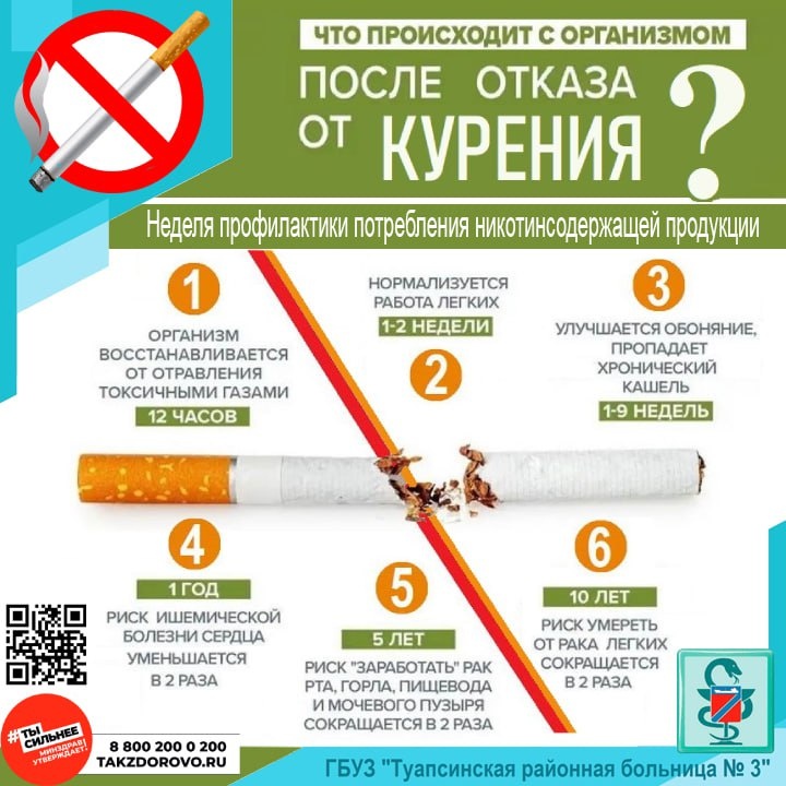 ЧТО ВАС ЖДЁТ ПРИ ОТКАЗЕ ОТ КУРЕНИЯ Первые заметные изменения в организме фиксируются уже через 12 часов. Спустя это время уровень монооксида углерода в выдыхаемом воздухе возвращается к норме. Примерно через две недели (в некоторых случаях через четыре) улучшается работа сердечно-сосудистой системы, становится легче дышать и двигаться. Через месяц бросившие курить отмечают уменьшение кашля, одышки, проблем с дыханием. В этот период (иногда он занимает до девяти месяцев) восстанавливается работа легких. Долгосрочные эффекты: Через год после отказа от вредной привычки риск развития ишемической болезни сердца снижается в два раза. Через пять лет - значительно снижается риск инсульта. Положительно влияет отказ от сигарет и на риск развития рака легких - он снижается на 30-50% через десять лет. Кроме того, отказ от курения может продлить жизнь: в 30 - на 10 лет, в 40 - на 9 лет, в 50 - на 6 лет, в 60 - на 3 года, заключили специалисты. #укреплениеобщественногоздоровья
