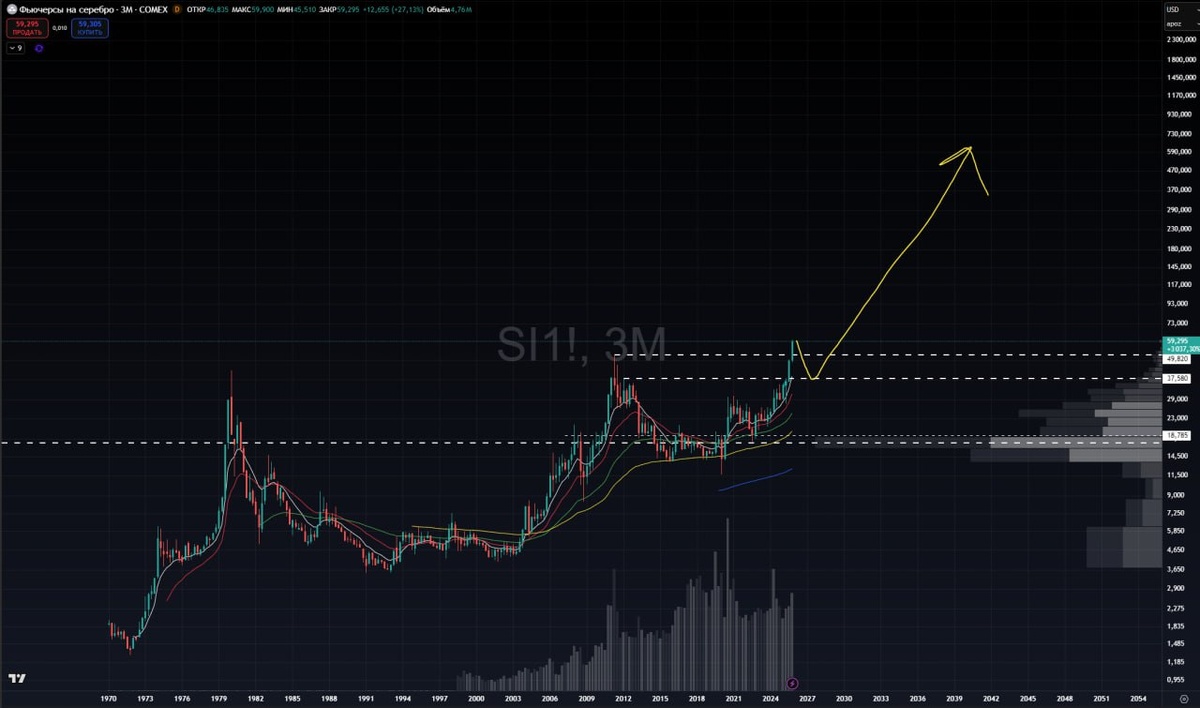 В ответ на пост Про золото как-то давно писал. Казалось нереальным, но половину пути уже прошло. Так же как и серебро сейчас. Думаю, что в следующие несколько лет мы увидим серебро выше 500$