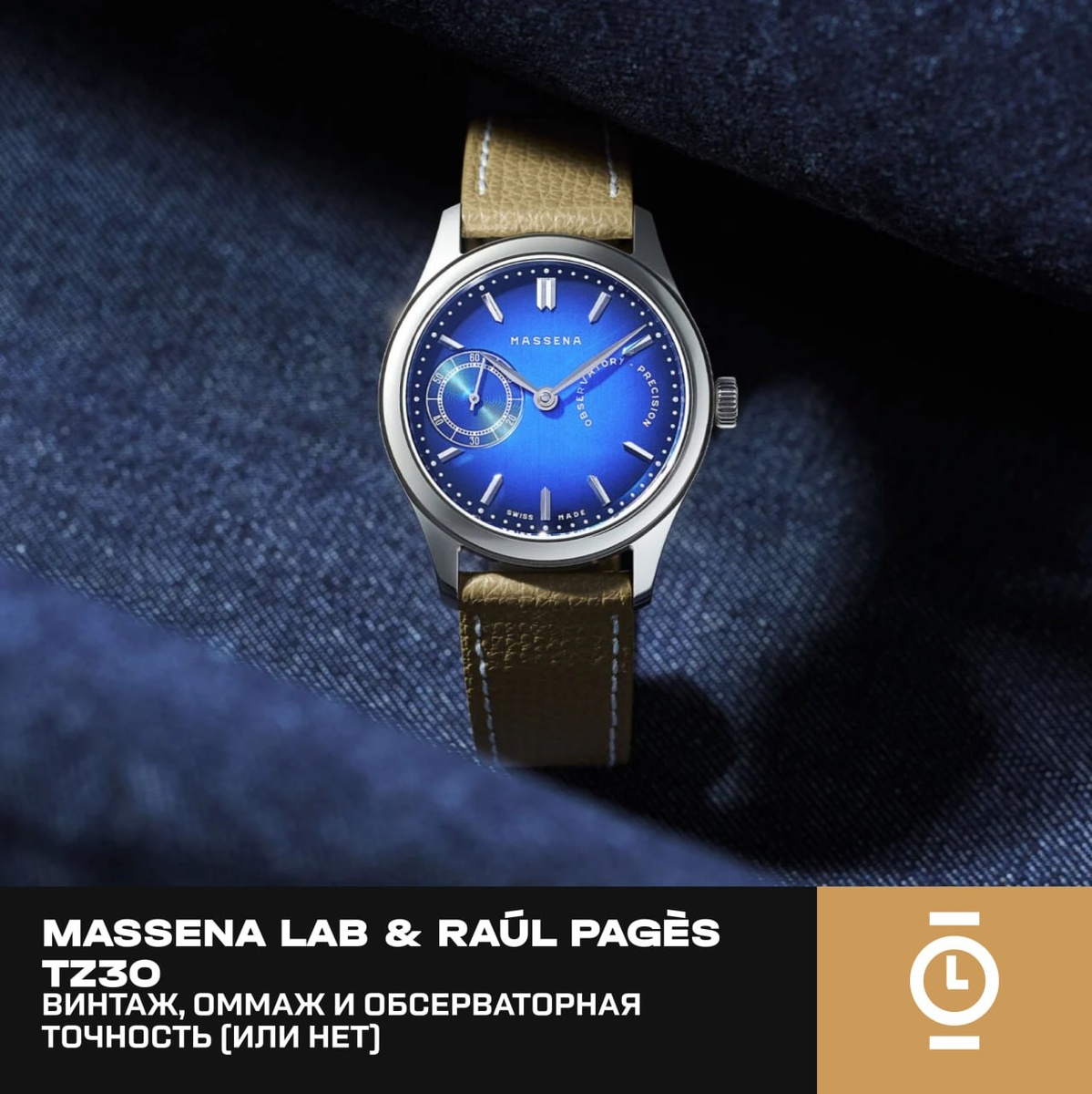 MASSENA LAB & RAÚL PAGÈS TZ30: ВИНТАЖ, ОММАЖ И ОБСЕРВАТОРНАЯ ТОЧНОСТЬ (ИЛИ НЕТ) #новости_WD У Massena LAB и лауреата Louis Vuitton Watch Prize 2024 Рауля Пажеса вышло уже несколько совместных лимиток: Magraph, Absinthe и другие. Сейчас тандем представляет ещё одну: TZ30, посвященную 30-летию сообщества любителей часов TimeZone. У неё винтажный стальной корпус диаметром 38,5 мм и толщиной 10 мм. Насыщенный синий циферблат с вертикальным брашированием играет оттенками в зависимости от освещения, и на нем отлично смотрятся сияющие родированные стрелки и метки. Минималистичный дизайн отсылает к прошлогодней лимитке Massena LAB & Raúl Pagès 1952, которая, в свою очередь, была оммажем специальной модели Patek Philippe для одного из самых преданных фанатов марки. С механизмом всё очень интересно. На циферблате написано «Observatory Precision», но для часов публично не заявлены ни сертификат COSC, ни допустимая погрешность. Внутри механизм с ручным заводом Massena LAB M690 с частотой 28 80