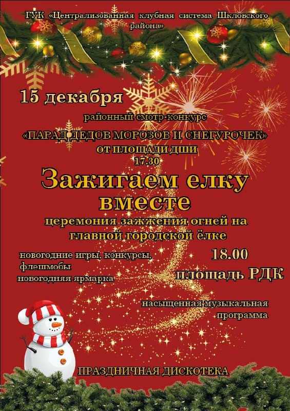 ✨15 декабря Шклов засияет огнями и праздничным настроением! 🎅🏻❄️В 17:30 стартует районный смотр-конкурс «Парад Дедов Морозов и Снегурочек» от площади ДШИ, а в 18:00 на площади РДК вместе зажжем главную городскую ёлку! Вас ждут новогодние игры, конкурсы, ярмарка, музыкальная программа и праздничная дискотека — приходите всей семьей, будет весело и по-настоящему волшебно!