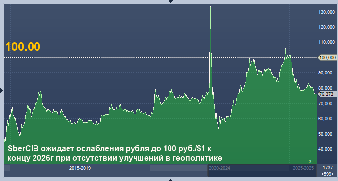 SberCIB ожидает ослабления рубля до 100 руб./$1 к концу 2026г при отсутствии улучшений в геополитике Курс доллара к рублю расчётный, фьючерс, вечный фьючерс и межбанк. Курс евро к рублю расчётный, фьючерс, вечный фьючерс и межбанк. Курс юаня к рублю биржевой, фьючерс, вечный фьючерс и межбанк. SberCIB Investment Research в базовом сценарии прогнозирует ослабление курса рубля до уровня 100 руб./$1 на конец 2026 года, сообщили аналитики инвестбанка в эфире, посвященном стратегии 2026 года. "Этому будет способствовать снижение ключевой ставки, что приведет к постепенному росту спроса на валюту, а также сокращение продаж валюты со стороны ЦБ и снижение цен на нефть", - отмечают они. Предложение валюты от экспорта и ЦБ может сократиться в следующем году на $2,4 млрд в месяц, что при прочих равных ослабит рубль на 7%, приводят оценки эксперты. В оптимистичном сценарии аналитиков (предполагает улучшении геополитической ситуации) рубль останется крепким (85 руб./$1 на конец 2026 года) благодар