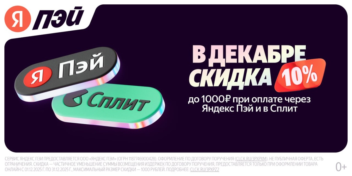 До 31 декабря доп скидка 10% при оплате через яндекс пэй и сплит на нашем сайте