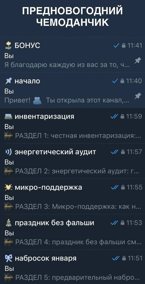 предновогодний чемоданчик 5 разделов по 3 методики в каждом + НАИПРИЯТНЕЙШИЙ БОНУС сегодня этот чемоданчик уже получила одна прекрасная девушка, а я чуть позже пойду забирать свой подарок на ВБ 😂♥️ а для тех, кто ещё сомневается, нужен ли ему этот 🧳: во-первых, не сомневайтесь, он нужен 😂 во-вторых, давайте я раскрою его наполнение: раздел 1 - честная инвентаризация ➡️ техника 1: три честных вопроса - чтобы снять розовые очки и увидеть год настоящим ➡️ техника 2: чемодан без ручки - чтобы найти скрытые ресурсы ➡️ техника 3: фиксация и отпускание - чтобы символически оставить тяжелое в уходящем году результат: понимание, что на самом деле было в году и легкое ощущение, что часть груза можно оставить позади раздел 2 - энергетический аудит ➡️ техника 1: где прячется усталость - чтобы осознать неочевидных воров твоих сил ➡️ техника 2: диагностика ты устала или это уже оно - чтобы объективно оценить стадию выгорания ➡️ техника 3: стоп-кран для нервов - чтобы быстро отключитьс