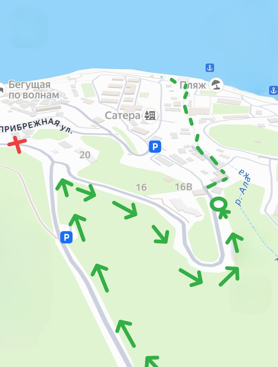 Так вот решили мы заехать, посмотреть что да как. С трассы свернули на нужном повороте, недолго проехали и встали на развилке... Налево дорога вниз к морю казалась короче, повернули в этом, направлении, но не угадали. Проехали совсем мало и уткнулись в шлагбаум. Поехали обратно вверх, и уже по другой дороге подъехали к домам. На карте ниже кружком обозначено место нашей парковки, потому что ниже уже был тупик, машин много, приткнуться, да и даже развернуться затруднительно.