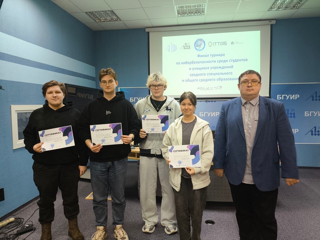 🌐👏🏻 Студенты ГГУ вошли в топ-10 на финале турнира «BSUIR:CTF» 🧩 Студенты факультета физики и ИИ приняли участие в Первом республиканском турнире по кибербезопасности «BSUIR:CTF». 👏🏻📝 По результатам студенты группы КБ-44 Татьяна Мельникова, Даниил Шумило, Максим Винокуров и Захар Савостенко заняли с 6 по 9 место и были награждены сертификатами.
