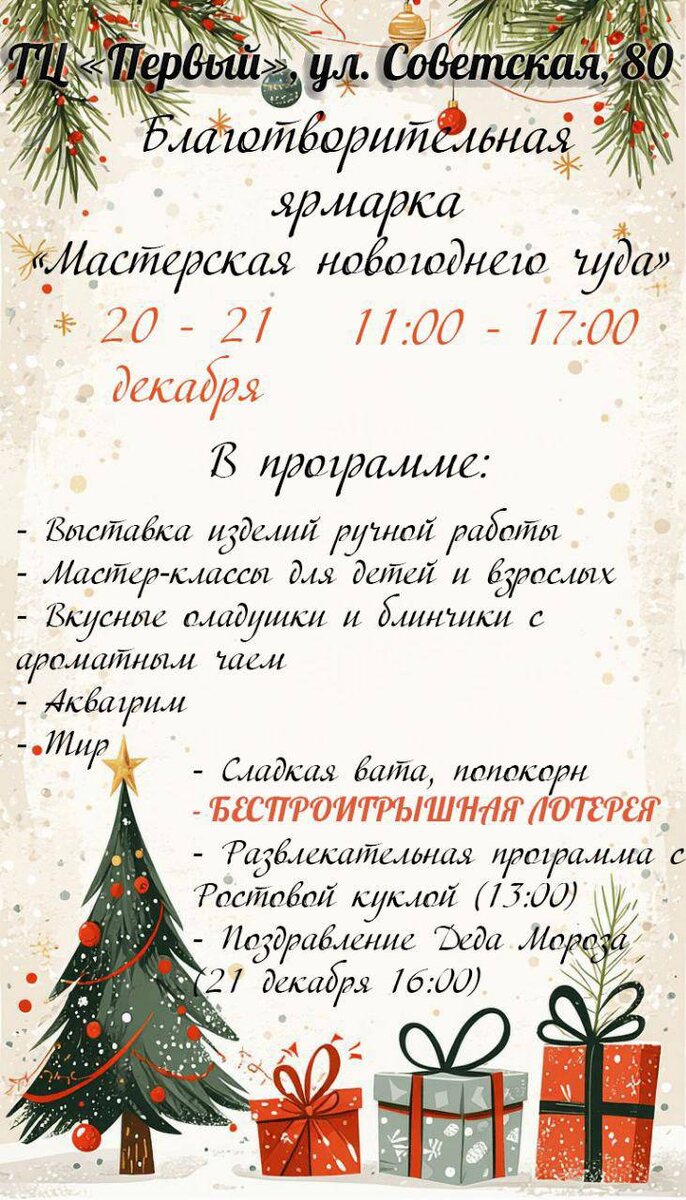 Благотворительная ярмарка «Мастерская новогоднего чуда» Друзья, ловите отличный план на предпраздничные дни! 20–21 декабря с 11:00 до 17:00 в ТЦ «Первый» (ул. Советская, 80) будет работать благотворительная ярмарка «Мастерская новогоднего чуда». В программе: — выставка изделий ручной работы, — мастер-классы для детей и взрослых, — вкусные оладушки и блинчики с ароматным чаем, — аквагрим, — тир, — сладкая вата и попкорн, — беспроигрышная лотерея, — развлекательная программа с ростовой куклой (в 13:00), — поздравление Деда Мороза (21 декабря в 16:00). Приходите всей семьёй: здесь можно выбрать подарки, вкусно перекусить, повеселиться с детьми и поддержать благотворительную инициативу. Пусть ваши выходные пройдут в атмосфере праздника, добрых дел и новогоднего настроения! ✨