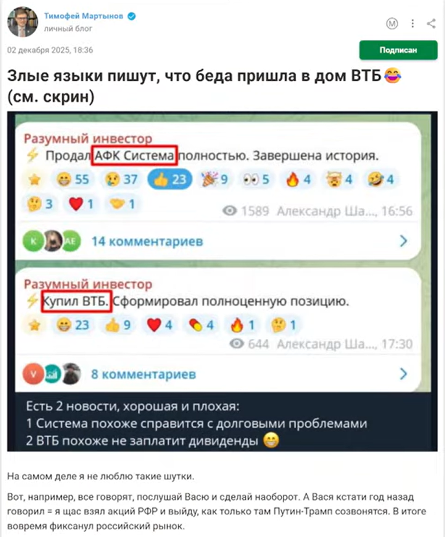 Саммари «Антикризиса». Выжимка от котов. Выжимка про «мирные акции», долги АФК Системы, психологи. Толпы, и многое другое 👉смотреть в оригинале на YouTube (канал Тимофея) ❤️мы будем рады Вашей подписке в TG, там будем делать анонсы Часто сталкиваюсь, что иногда удобно слушать онлайн или в записи, а иногда нет времени и хочется пробежаться тезисно по обсуждаемым темам. Мы подготовили текстовую версию, и будем выкладывать ее регулярно. Только на Смарте, без копипасты🤟 💙 Выпуск от 8 декабря Рынок: декабрь, ожидания и драйверы Декабрь исторически вялый, но рынок сейчас живёт исключительно новостями: решение ЦБ 19 декабря и динамика мирных переговоров. Техническая картина по индексу Мосбиржи улучшилась, но уверенности нет. Понимания сейчас у рынков меньше, чем год назад. Сезон отчётности завершён: все ключевые компании отчитались за 3-й квартал, резких сюрпризов не осталось Мирная сделка: эмоциональный фактор Рынок каждый день «перетягивают» новости о перемирии. Американцы явно заинтер