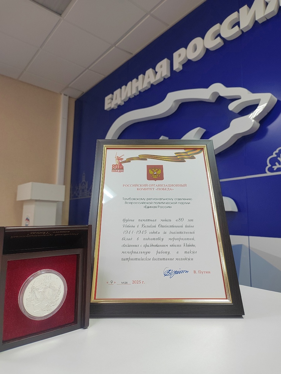 Тамбовское региональное отделение «Единой России» удостоено памятной медали «80 лет Победы»