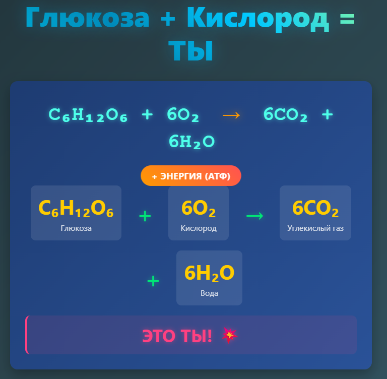 Глюкоза + Кислород = Углекислый газ + Вода + ТЫ, КОТОРЫЙ ЖИВЁТ.