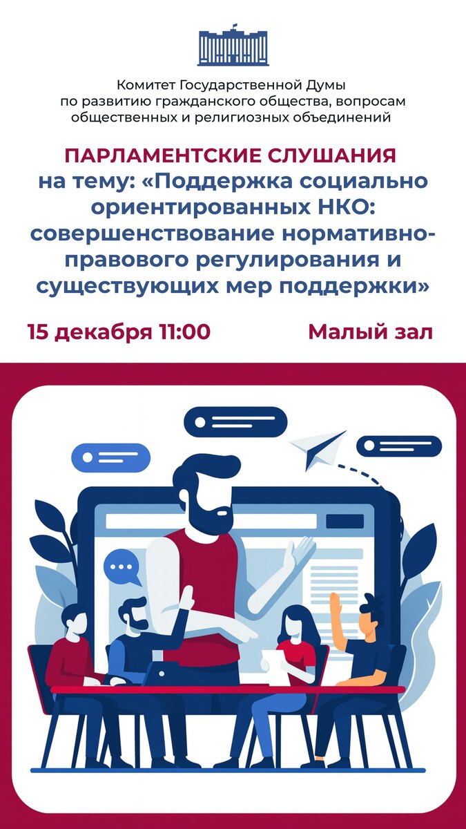 ‼️ПРЕСС-АНОНС В Госдуме состоятся парламентские слушания: «Поддержка социально ориентированных НКО: совершенствование нормативно-правового регулирования и существующих мер поддержки». Когда: 15 декабря в 11:00 Где: Государственная Дума, Охотный ряд, 1, малый зал Мероприятие организовано Комитетом ГД по развитию гражданского общества, вопросам общественных и религиозных объединений. За 30 лет в России сформировалась мощная экосистема некоммерческих организаций, которые помогают миллионам людей. Но действующее регулирование подчас создает избыточную нагрузку и тормозит развитие сектора. Необходимо найти баланс. Сохранить прозрачность и контроль, но при этом существенно упростить жизнь социально ориентированным НКО. Дать больше возможностей для работы и доступа к ресурсам. Основные темы для обсуждения: 👉Итоги 30-летнего развития законодательства о НКО и влияние реформ Гражданского кодекса РФ на гражданское общество. 👉Пробелы и дублирование в нормативной базе, практика Минюста Росси