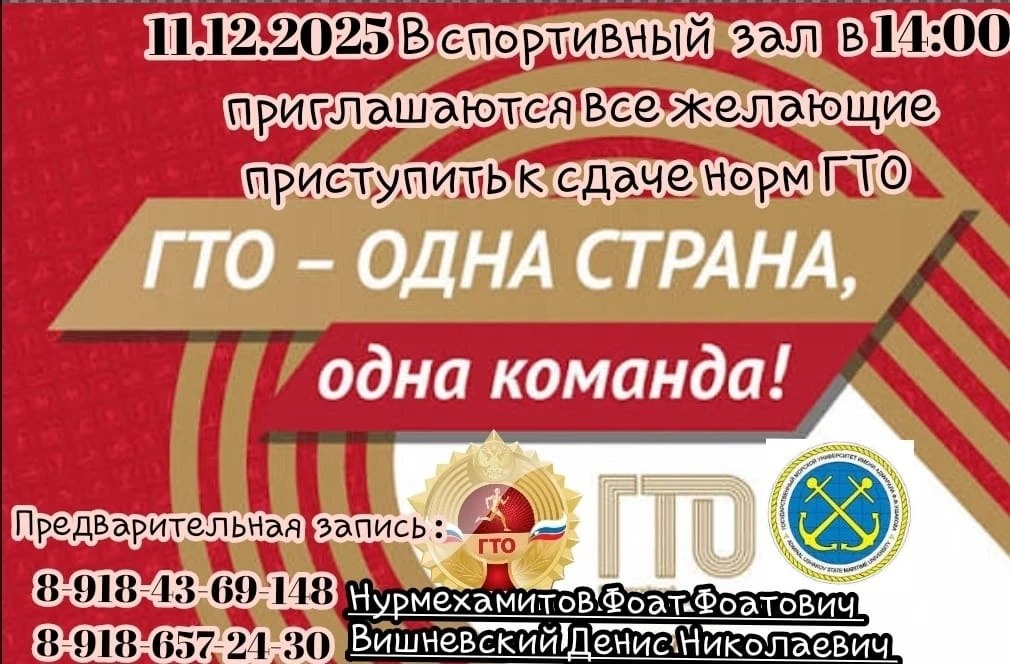 Сдай нормы ГТО! Приглашаем всех желающих попробовать свои силы. Самых спортивных и выносливых ждём в спортзале университета 11 декабря 2025 года в 14:00✅ Форма одежды - спортивная👍💪👏 #ушаковкарф