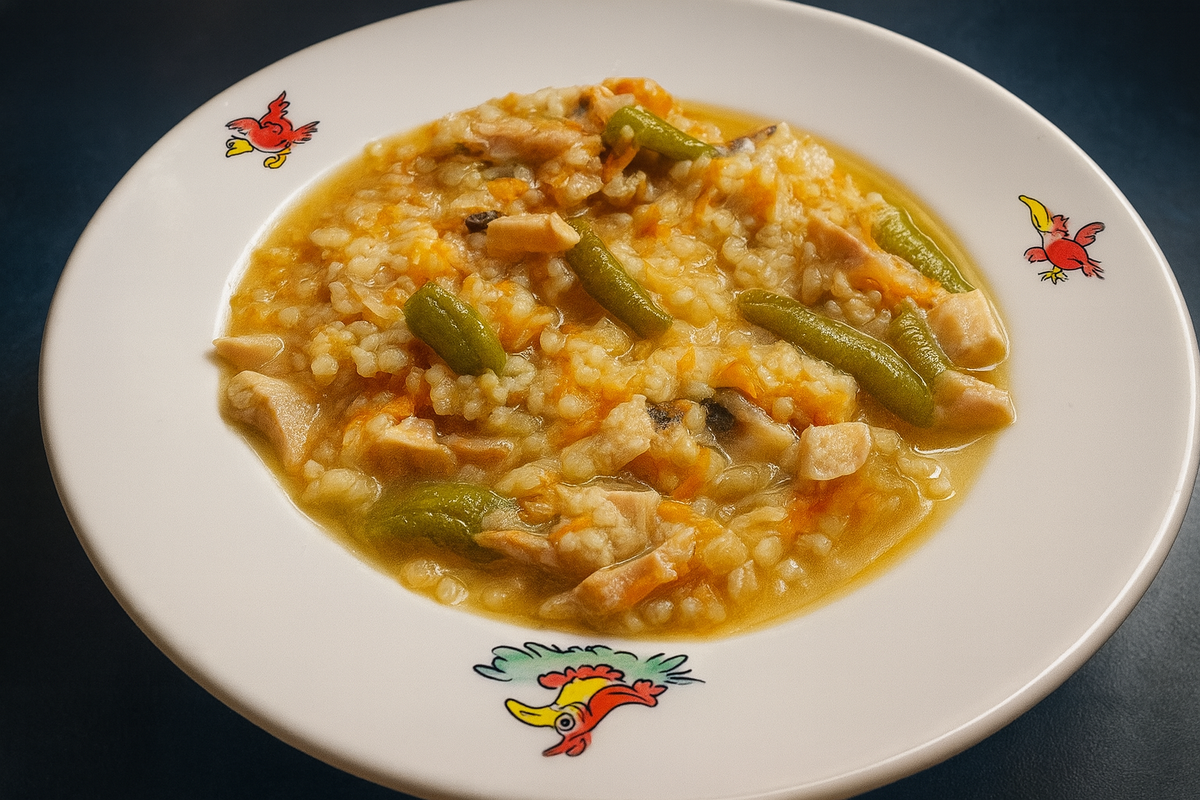 Не знаю как у других, но мой сын не любит сухую, твердую и крупинчатую пищу. Часто ему больно жевать, так как впереди у нас еще 6 зубов. Стараюсь ему делать что-то овощное, сочное, но сытное с мясом. Итак, давайте приготовим сочный кус-кус с курочкой, грибами и овощами. Нам понадобится (на 2 порции): Голень куриная 1 шт; Кус-кус 1 ст.л; Морковь 1/2 шт; Лук 1/2 шт; Фасоль стручковая 2 ст.л; Шампиньоны 1 шт; Сливочное масло 1 ч.л; Соль. Куриную голень потушить. Овощи почистить, мелко нарезать. В сотейнике с толстым дном тушим лук, морковь. Добавляем стручковую фасоль, продолжаем тушить. Готовое куриное мясо и грибы нарезать. Добавляем в овощи. Тушим под закрытой крышкой еще 5 минут. Затем добавляем воды, чтобы она полностью покрывала мясо и овощи. Добавляем кус-кус, солим, добавляем сливочное масло. Тушим еще 5 минут и выключаем огонь. Остужаем и подаем. Приятного аппетита! Надеюсь, этот рецепт порадует вашего маленького гурмана! Буду безмерно рада, если вы поделитесь фото результат