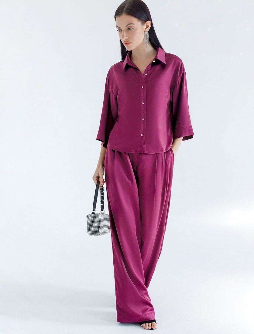 Блузка с короткими рукавами из плотного струящегося сатина - та самая вещь, которая сработает и в праздничном образе, и на каждый день. Стилизация на праздничный выход: Такую блузку легко превратить в вечерний акцент: добавьте к ней брюки из экокожи или атласную юбку миди, туфли на каблуке и заметные серьги. Мягкий блеск сатина делает образ нарядным без лишнего декора, поэтому она уместна и на новогоднем ужине, и в ресторане. Стилизация на каждый день: В повседневных комплектах блузка работает как базовый верх: её просто сочетать с прямыми джинсами, костюмными брюками или юбкой-карандаш. Для офиса достаточно добавить жакет и лаконичные украшения - образ получится сдержанным, но собранным и современным. Дополнительные идеи стилизации: - Заправьте блузку в широкие брюки и дополните ремнем с выразительной пряжкой - получится актуальный «офисный вечер» на случай, если после работы планируется выход. - Носите её навыпуск с узкими брюками и лодочками, добавив яркую сумку или помаду -