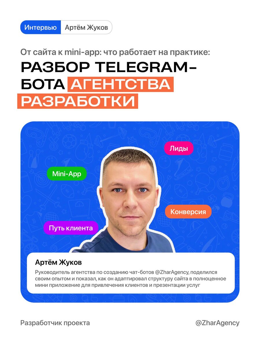 💪 Как владелец агентства по разработке ботов создал мини-приложение для своего бизнеса На этот раз в формате #Интервью наш постоянный эксперт 👤 Артем Жуков. Он поделился своей историей и рассказал про все этапы: • Почему возникла необходимость в отдельном боте • Какие функции решили в него добавить • Как выстроить пользовательский путь • И под какие ниши подходит формат с мини-приложением Бот: https://t.me/ZharAgencyBot