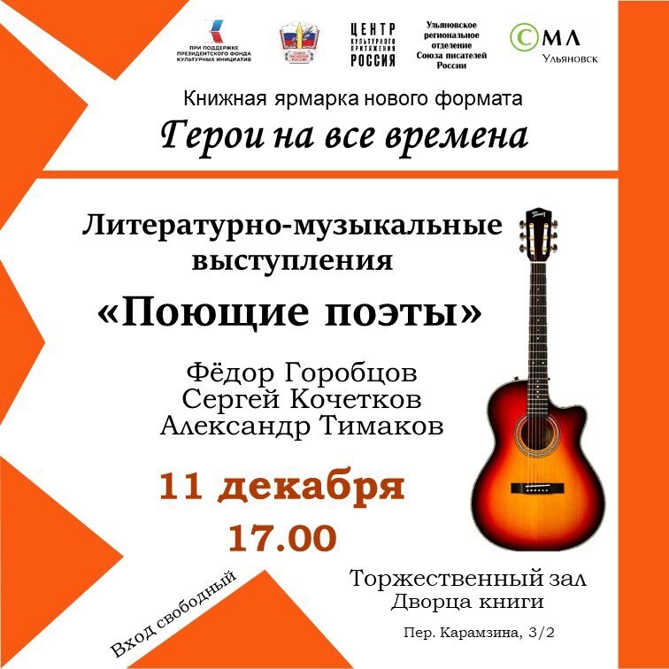📅11 декабря в 17.00 в Торжественном зале Дворца книги выступят ульяновские барды Александр Тимаков, Фёдор Горобцов и Сергей Кочетков. 🎸На концерте авторы исполнят собственные песни, в которых раскрываются темы любви, добра и зла, войны и мира, времени и вечных человеческих ценностей. 📢Вход свободный! Телефон для справок: 44-30-99