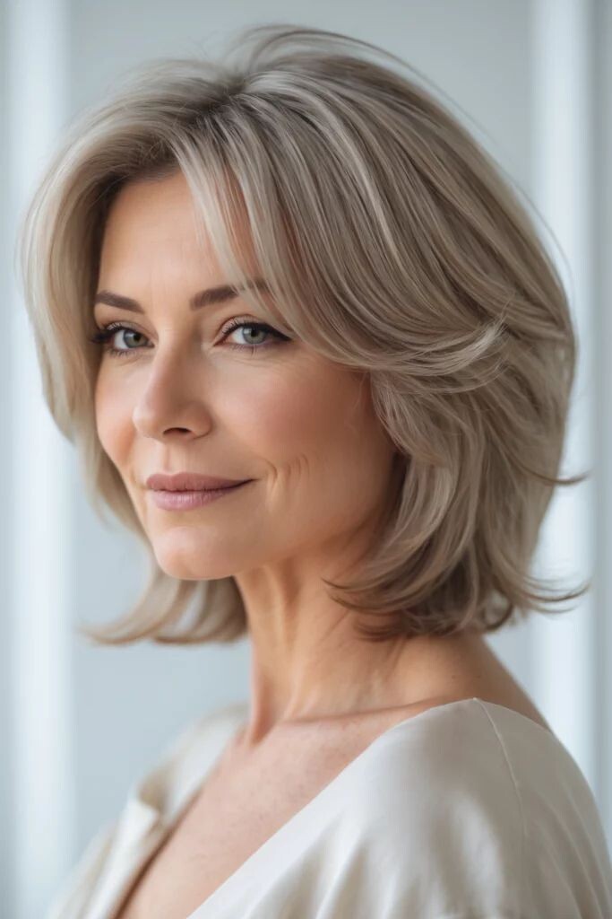 Косая или рваная челка: Смягчает черты лица, придает образу легкость и игривость. Она отлично маскирует мелкие морщинки вокруг глаз и придает взгляду выразительность.