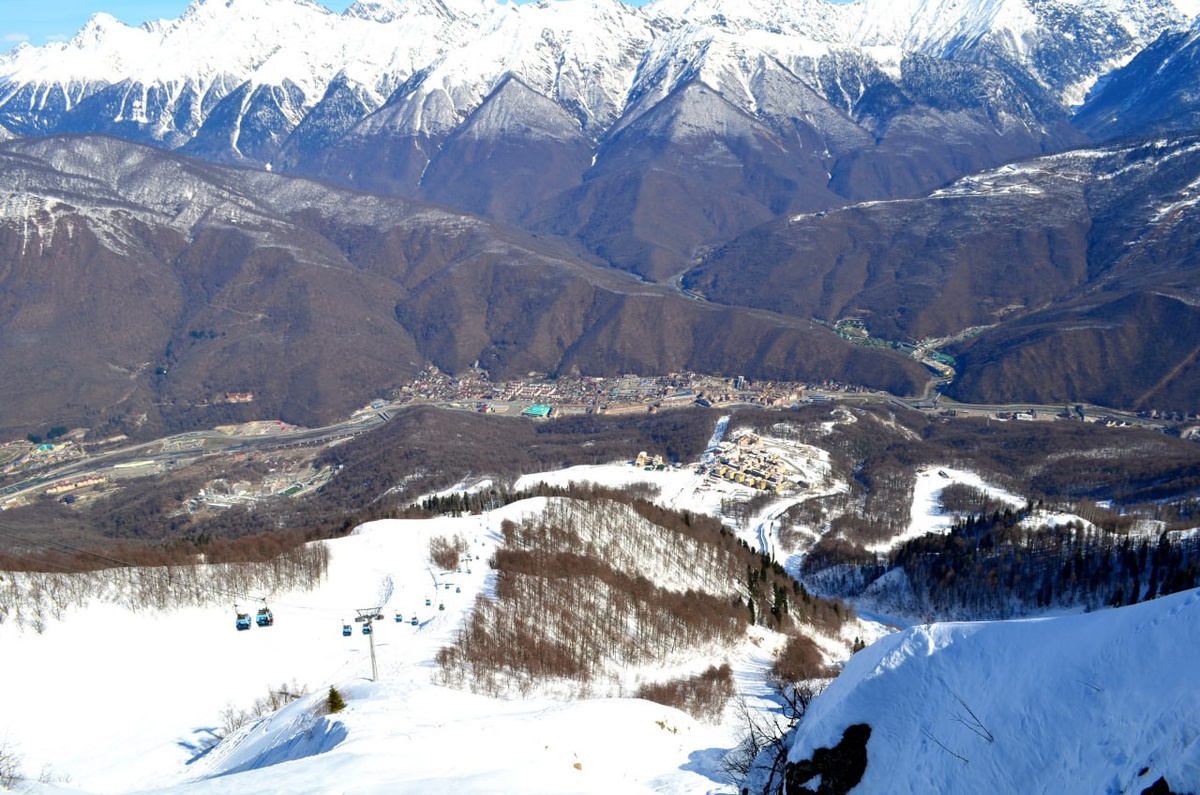 Красная Поляна, Эстосадок, Горки-город. Виды кавказских гор, горнолыжные трассы, горные вершины, хребты, пейзаж, природа, панорама, снег, сугробы, драйв