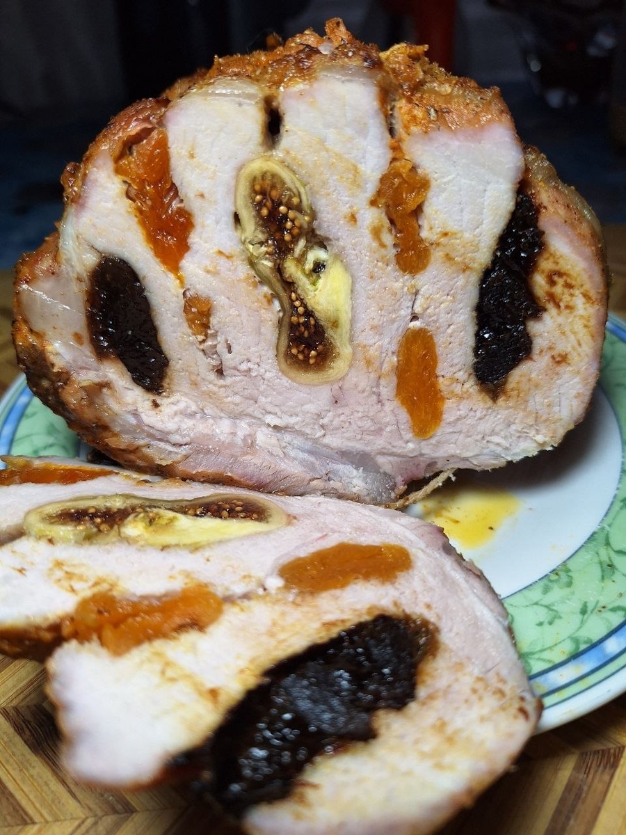 На мясе делаем пять продольных разрезов не дорезая конца, каждый разрез просаливаем, чтобы мясо не получилось пресным. По центру выкладываем сухофрукты : по центру инжир, а по бокам курагу и чернослив. Затем мясо плотно перетягиваем кулинарной нитью.