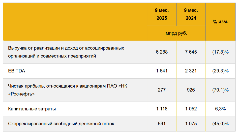 Роснефть опубликовала финансовые результаты по МСФО за III квартал и 9 месяцев 2025 г. Отчёт в сокращённой форме, но видно как санкции, укрепление ₽, падение цены на нефть, тарифы естественных монополий и долговая нагрузка влияют на финансовое положение компании, но по сравнению с прошлым кварталом есть прогресс (цена сырья возросла+РФ нарастила добычу). Отмечаю значительный рост свободного денежного потока: 🛢 Выручка: III кв. 2₽ трлн (-18% г/г), 9 м. 6,3₽ трлн (-17,8% г/г)