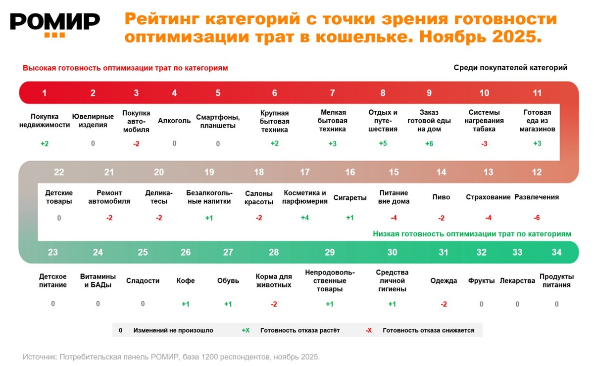 РОМИР: от чего россияне не готовы отказаться Представляем результаты ежемесячного исследования на базе Потребительской панели РОМИР – рейтинг категорий продуктов, товаров и услуг по готовности россиян оптимизировать на них свои траты (данные за ноябрь 2025 года). 🔸 В «зеленой зоне» рейтинга находятся категории, которые покупатели считают базовыми. В топ-3 традиционно вошли: продукты питания, лекарства и фрукты – от этих позиций россияне откажутся в последнюю очередь. 🔸 Важность других категорий базовой корзины остается высокой: это средства личной гигиены, непродовольственные товары, обувь, кофе, сладости, витамины и БАДы, детское питание. При этом роль ряда товаров из базовой корзины стала более значимой, чем месяцем ранее, – это одежда и корма для животных. 🔸 Россияне готовы отказаться или отложить на неопределенный срок покупку недвижимости, ювелирных изделий, автомобиля. Причем готовность отказа от категории «недвижимость» растет, а отказа от покупки автомобиля, наоборот, с