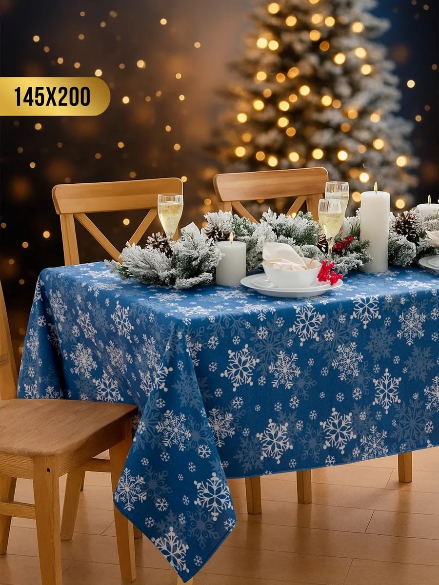 Скатерть 145х200 новогодняя тканевая на стол. Скатерть тканевая 145х200 – это прекрасный выбор для создания праздничной атмосферы в вашем доме для встречи Нового 2026 года - года Лошади.! Эта прямоугольная скатерть сделана из декоративной рогожки и выполнена из 100% хлопка. Ее синяя основа, украшенная снежинками, добавит особый шарм и блеск вашей праздничной сервировке. Смотрите соседние карточки. Цена: 675 руб. Ссылка: https://www.wildberries.ru/catalog/481346317/detail.aspx?targetUrl=SN